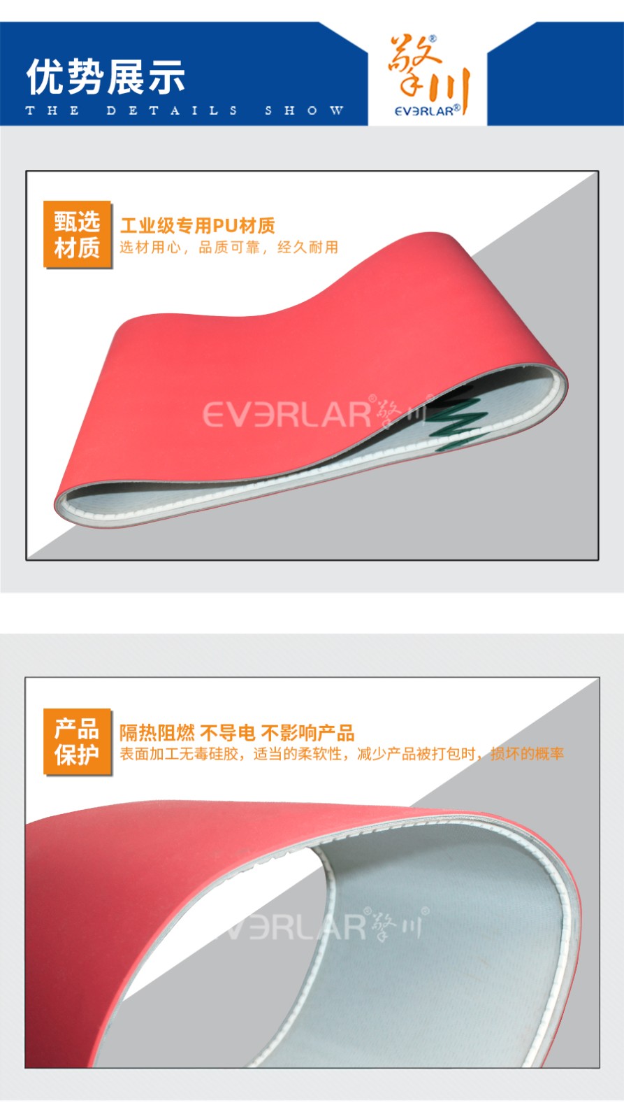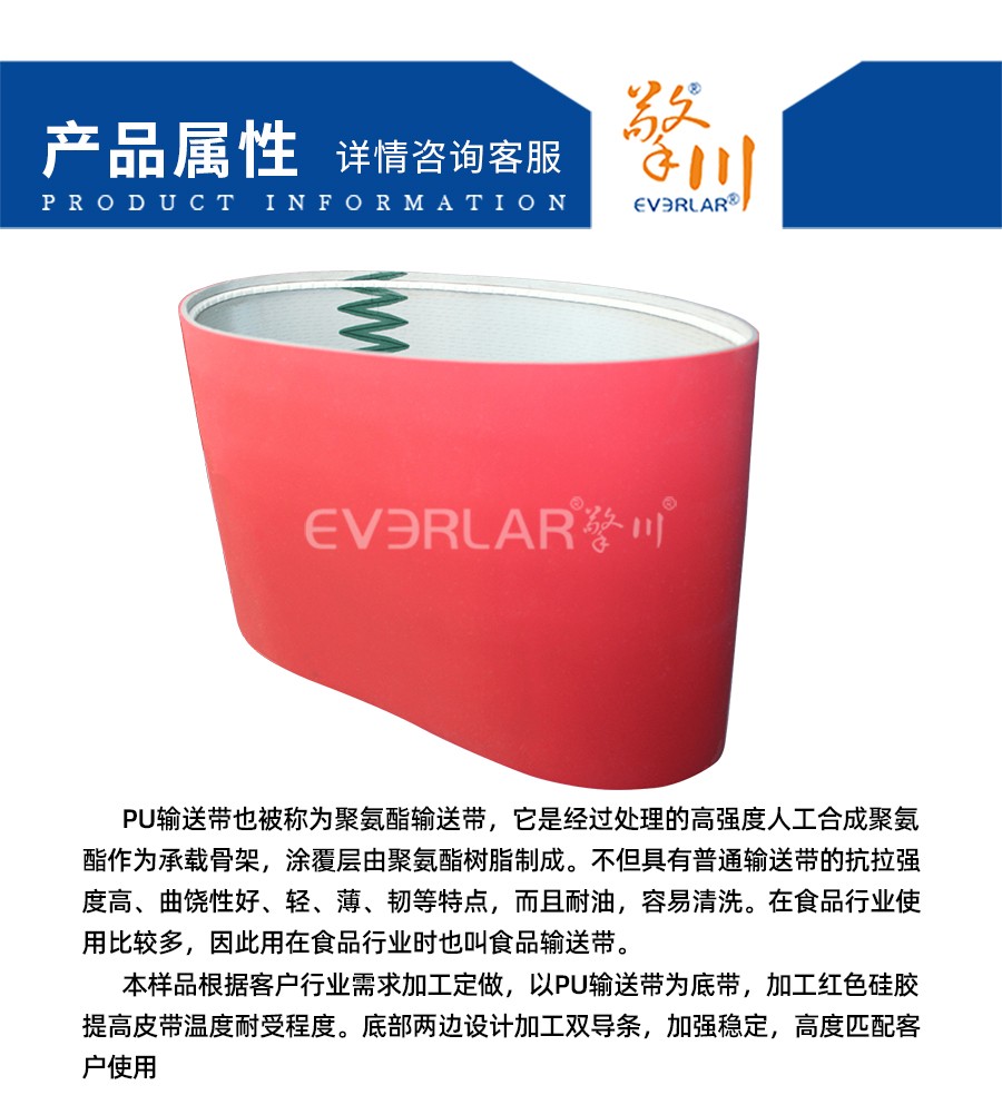 本樣品根據(jù)客戶行業(yè)需求加工定做,以PU輸送帶為底帶,加工紅色硅膠提高皮帶溫度耐受程度。底部兩邊設(shè)計加工雙導(dǎo)條,加強穩(wěn)定,高度匹配客戶使用。