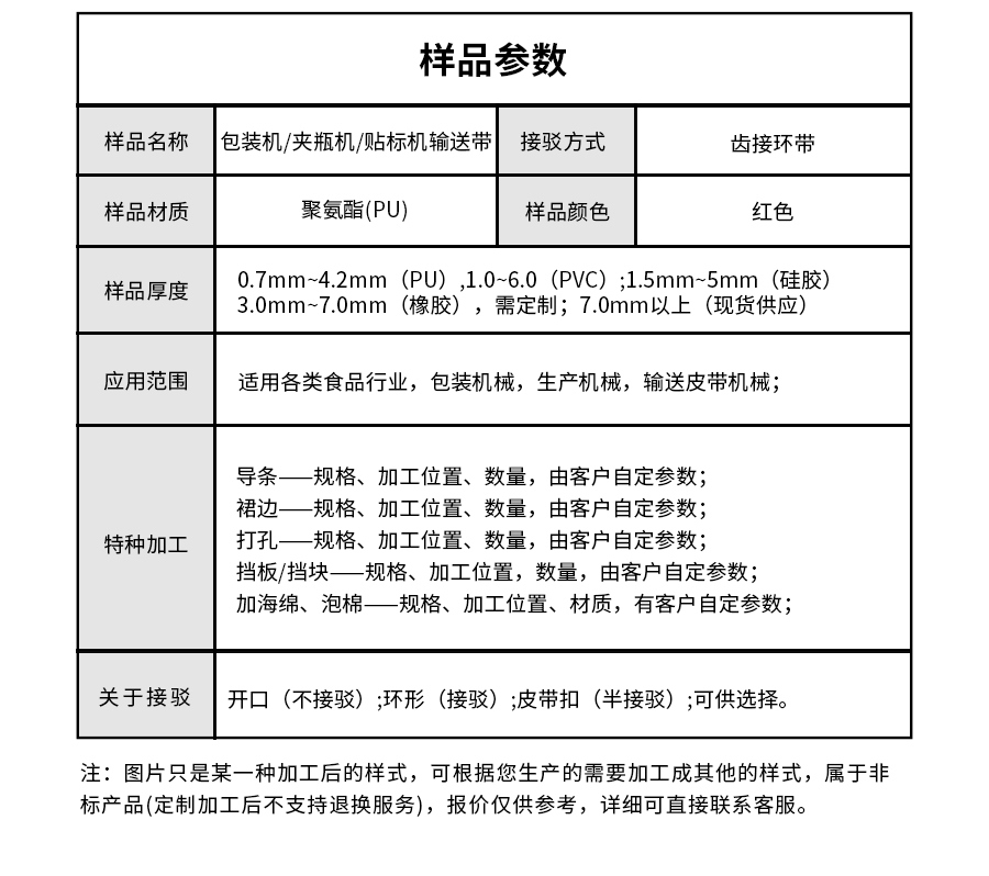 | 樣品名稱 | 包裝機、夾瓶機、貼標機輸送帶 | 接駁方式 | 齒接環(huán)帶 |