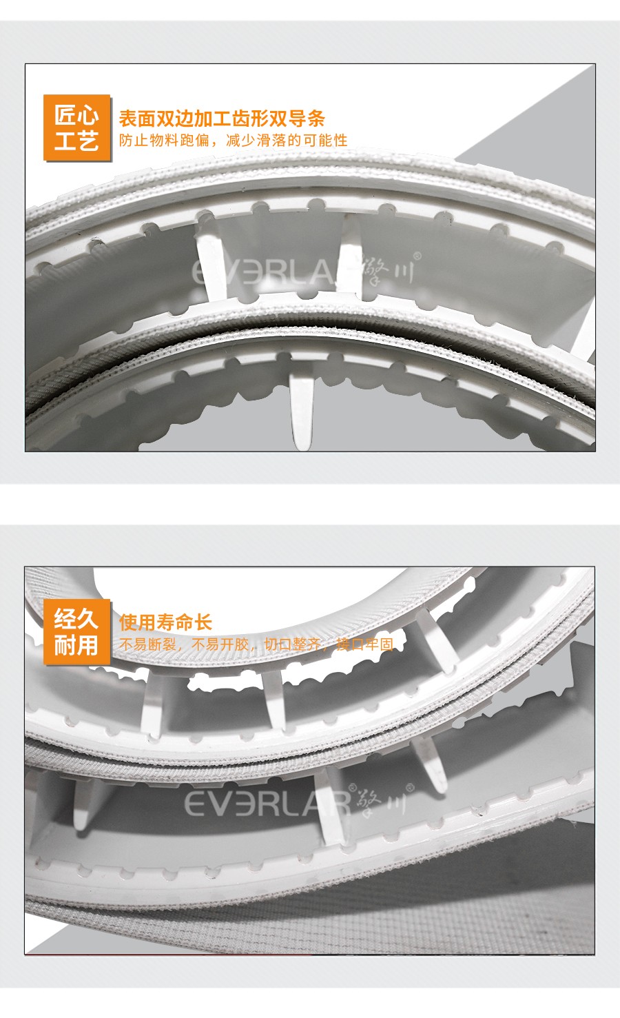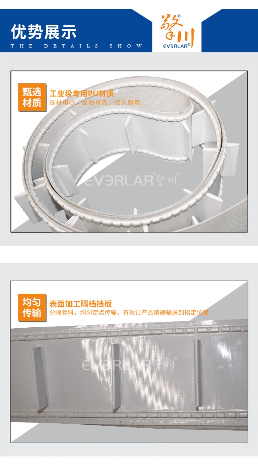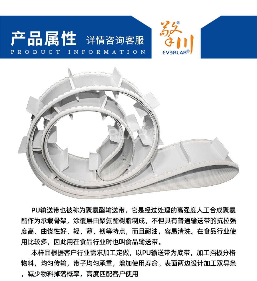 本樣品根據(jù)客戶行業(yè)需求加工定做,以PU輸送帶為底帶,加工擋板分格物料,均勻傳輸,帶子均勻承重,增加使用壽命。表面兩邊設(shè)計(jì)加工雙導(dǎo)條,減少物料掉落概率,高度匹配客戶使用。