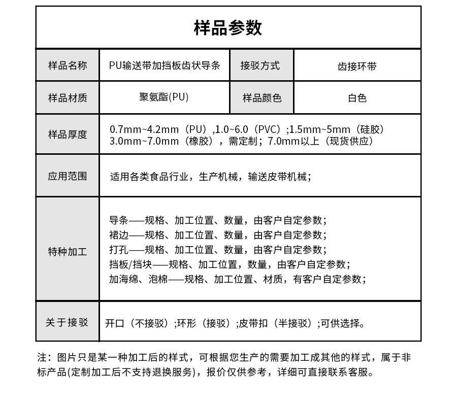| 樣品名稱 | 白色PU輸送帶加擋板齒狀導(dǎo)條 | 接駁方式 | 齒接環(huán)帶 |