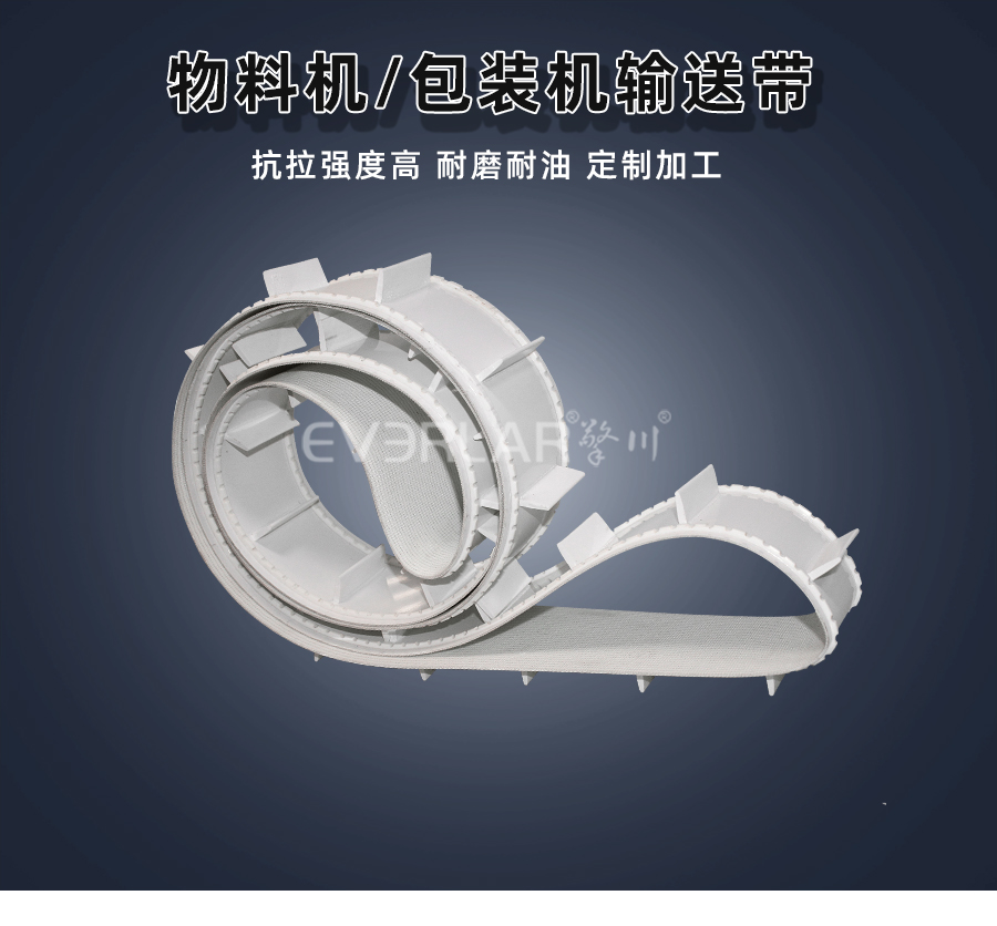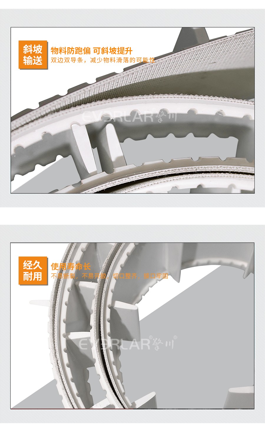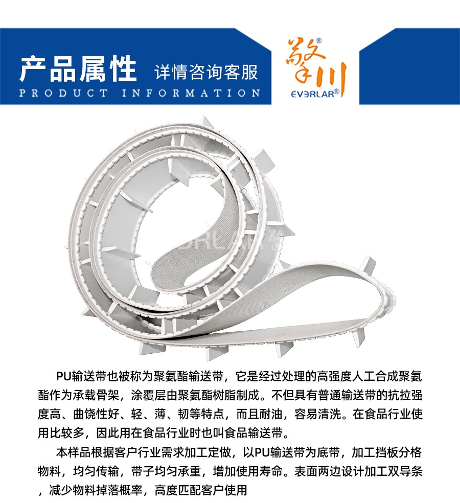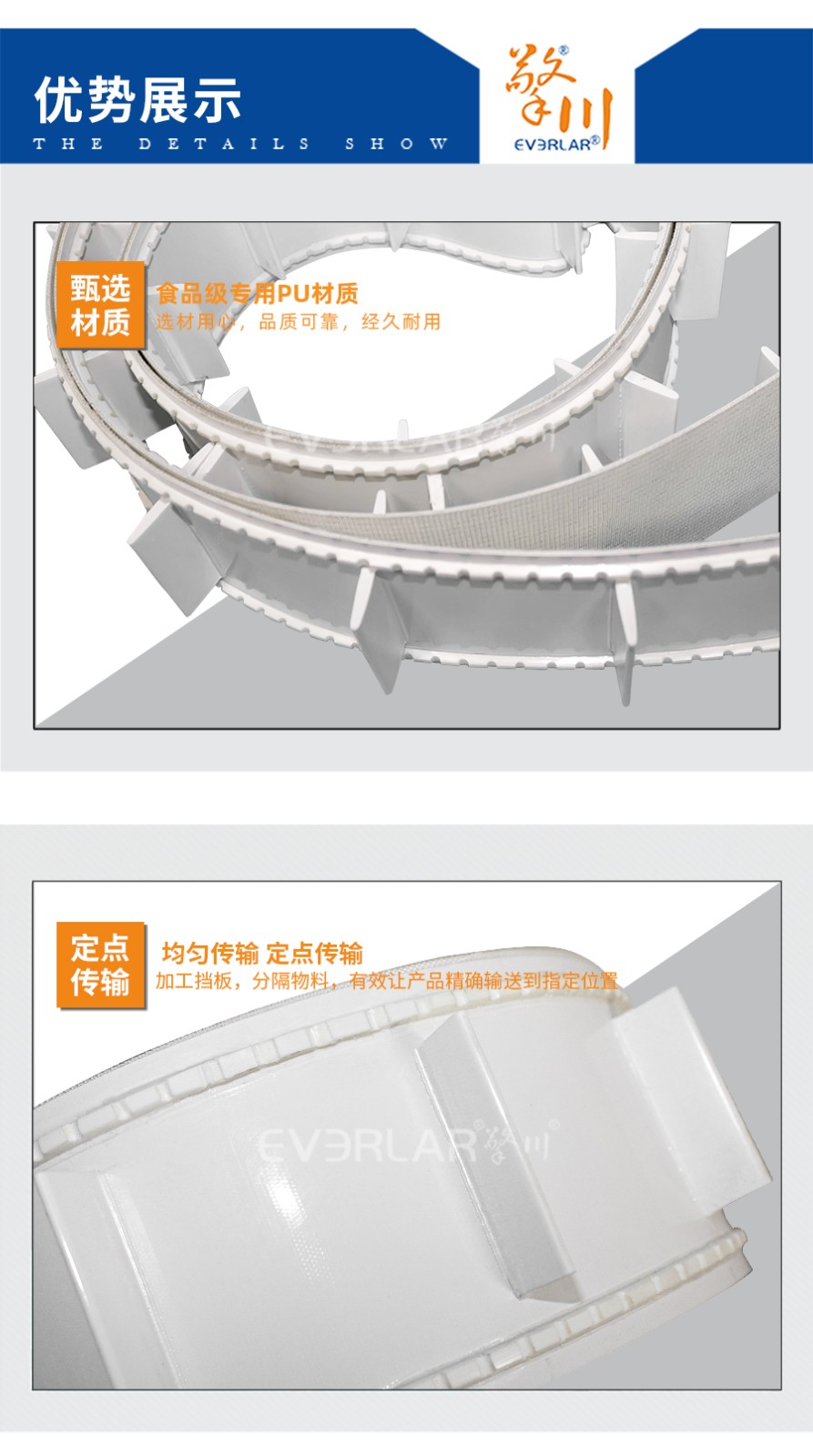 本樣品根據(jù)客戶行業(yè)需求加工定做,以PU輸送帶為底帶,加工擋板分格物料,均勻傳輸,帶子均勻承重,增加使用壽命。表面兩邊設(shè)計加工雙導(dǎo)條,減少物料掉落概率,高度匹配客戶使用。