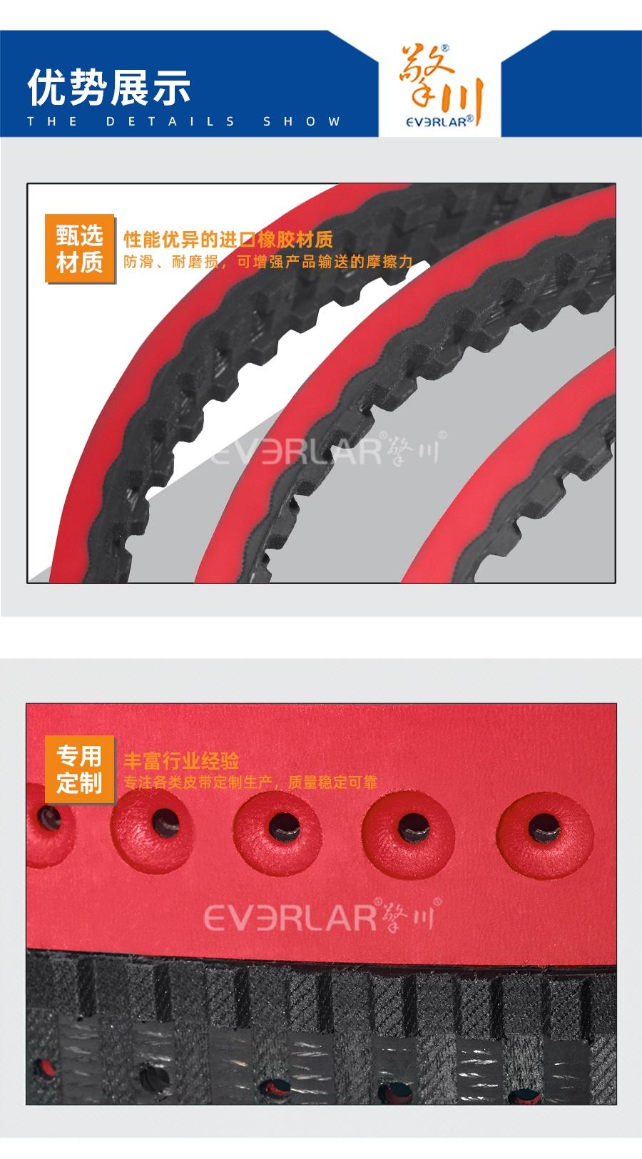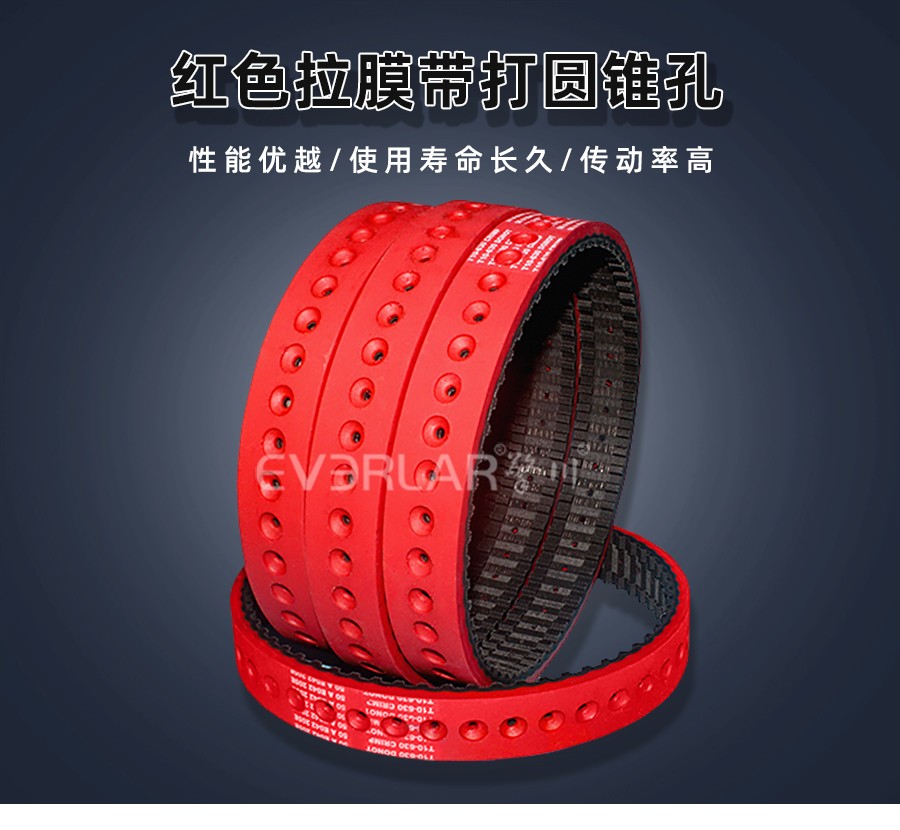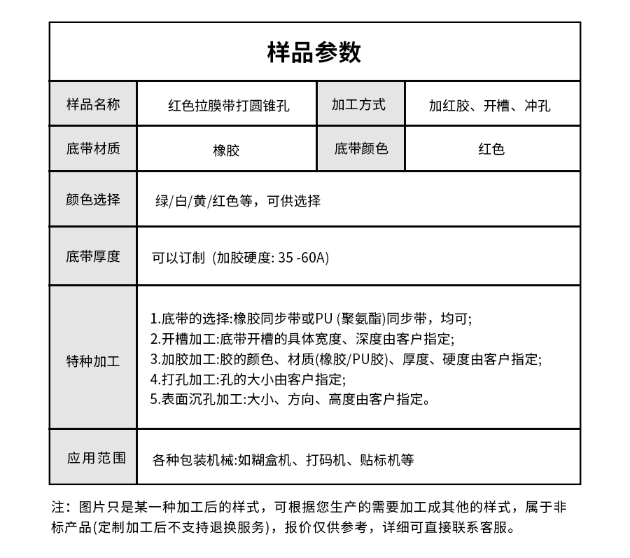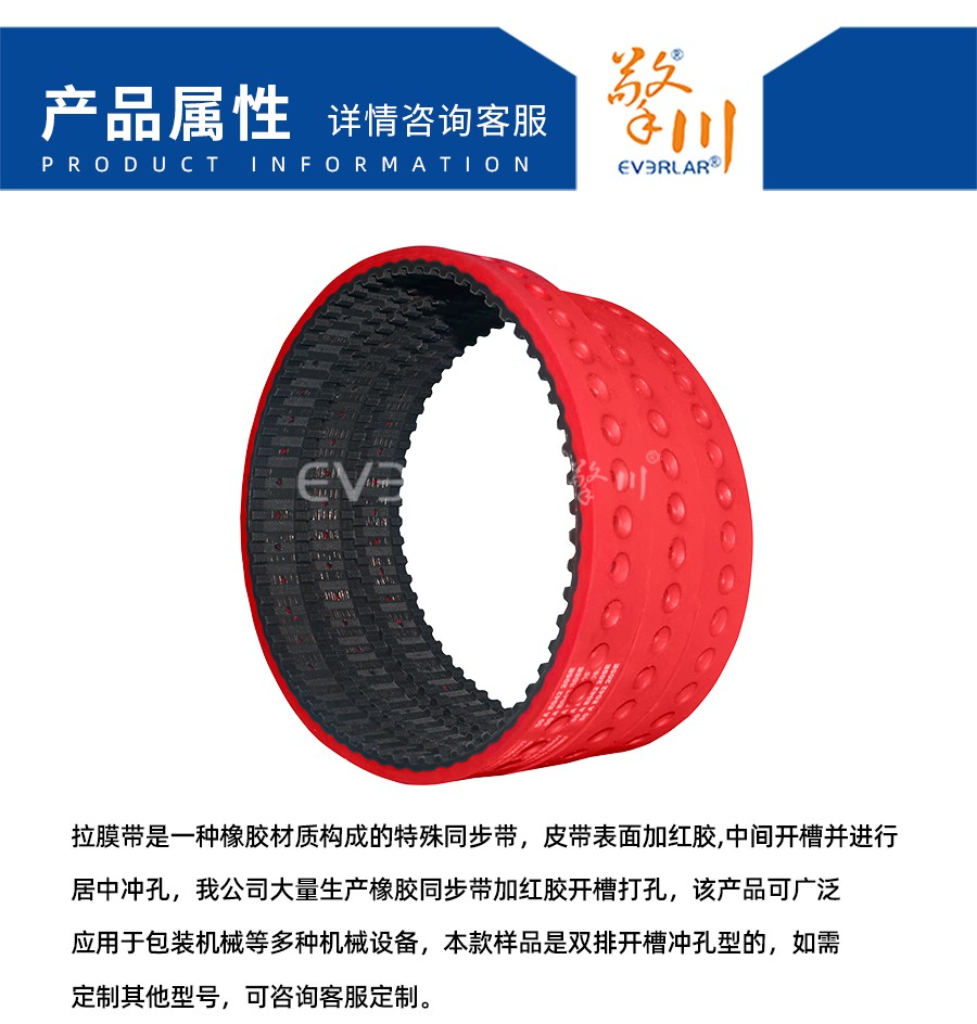 拉膜帶是一種橡膠材質(zhì)構(gòu)成的特殊同步帶,皮帶表面加紅膠,中間開槽并進行居中沖孔,我公司大量生產(chǎn)橡膠同步帶加紅膠開槽打孔,該產(chǎn)品可廣泛應(yīng)用于包裝機械等多種機械設(shè)備,本款樣品是雙排開槽沖孔型的,如需定制其他型號,可咨詢客服定制。