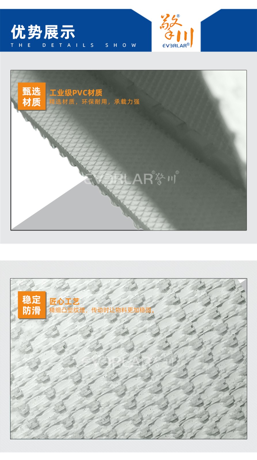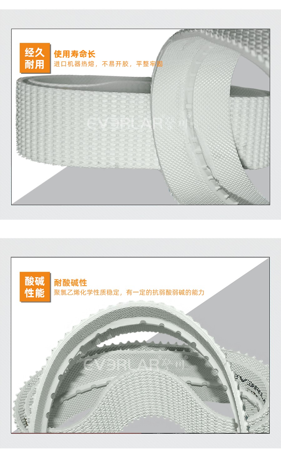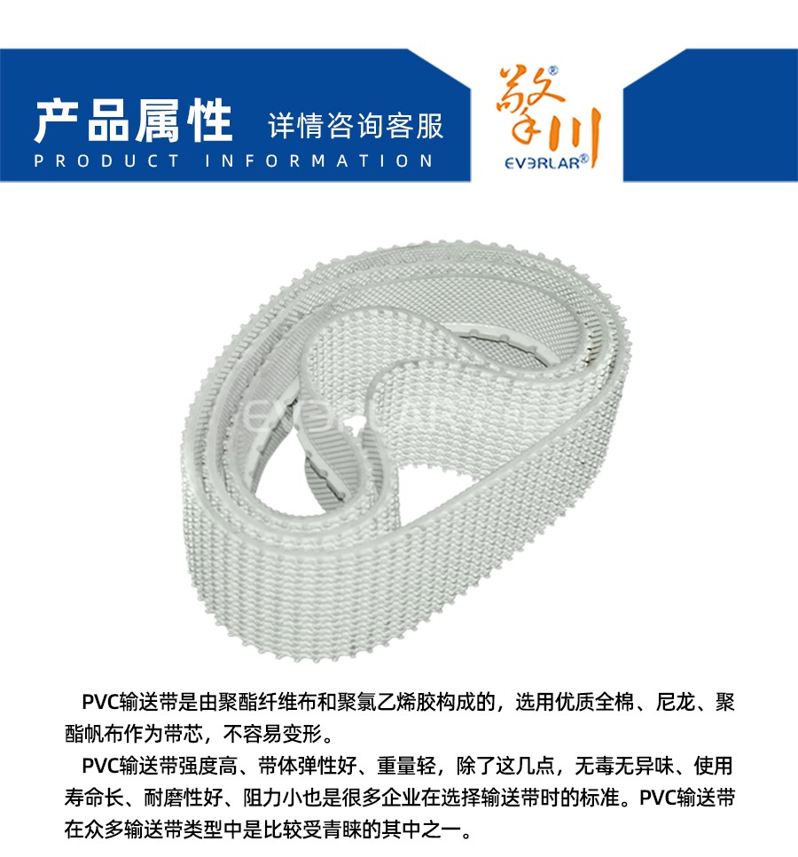 PVC輸送帶是由聚酯纖維布和聚氯乙烯膠構(gòu)成的,選用優(yōu)質(zhì)全棉、尼龍、聚酯帆布作為帶芯,不容易變形。