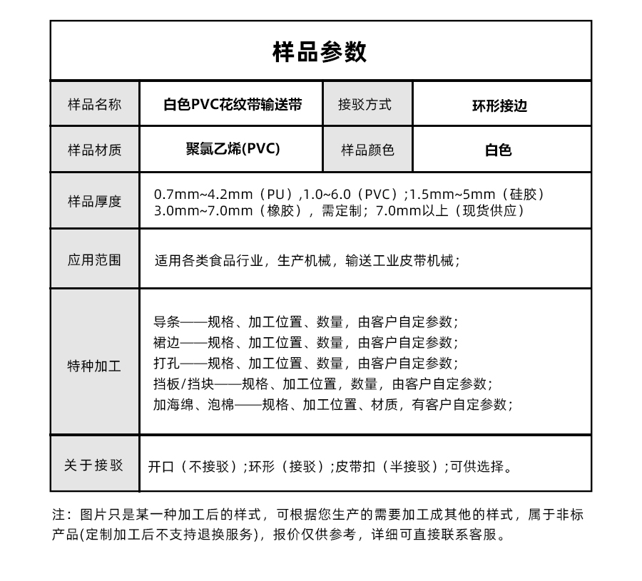 | 樣品名稱 | 白色PVC花紋帶輸送帶 | 接駁方式 | 環(huán)形接邊 |