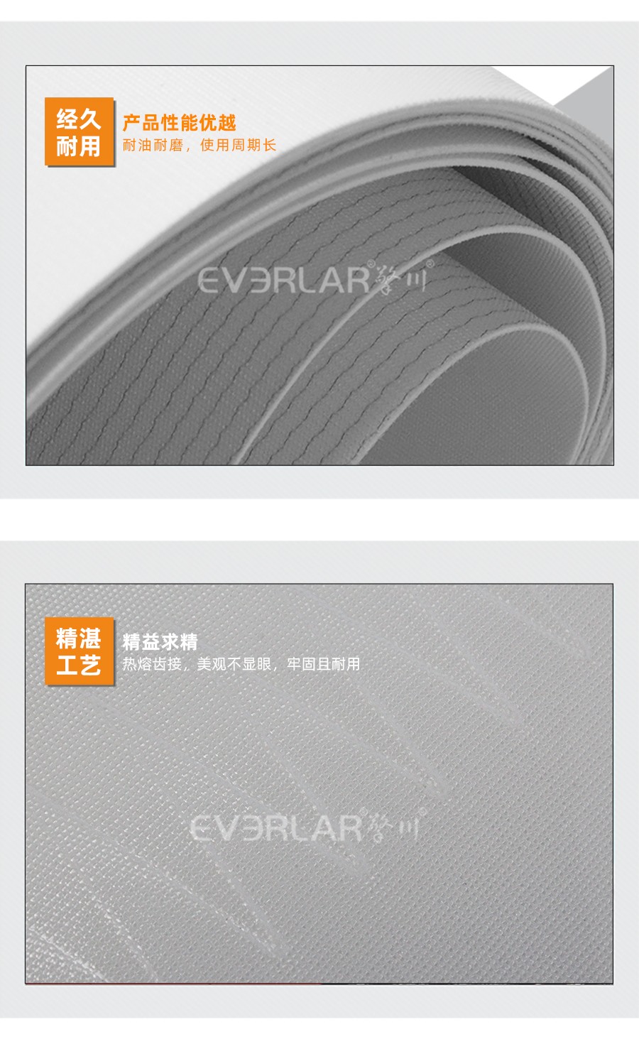 本樣品為PVC雙面纖維輸送帶,具有耐油的作用,摩擦系數(shù)大。我司的輸送帶長(zhǎng)度和寬度可根據(jù)客戶要求定制,另外可根據(jù)客戶需求對(duì)輸送帶進(jìn)行特殊加工,例如加導(dǎo)條,加擋板、擋塊及裙邊等。