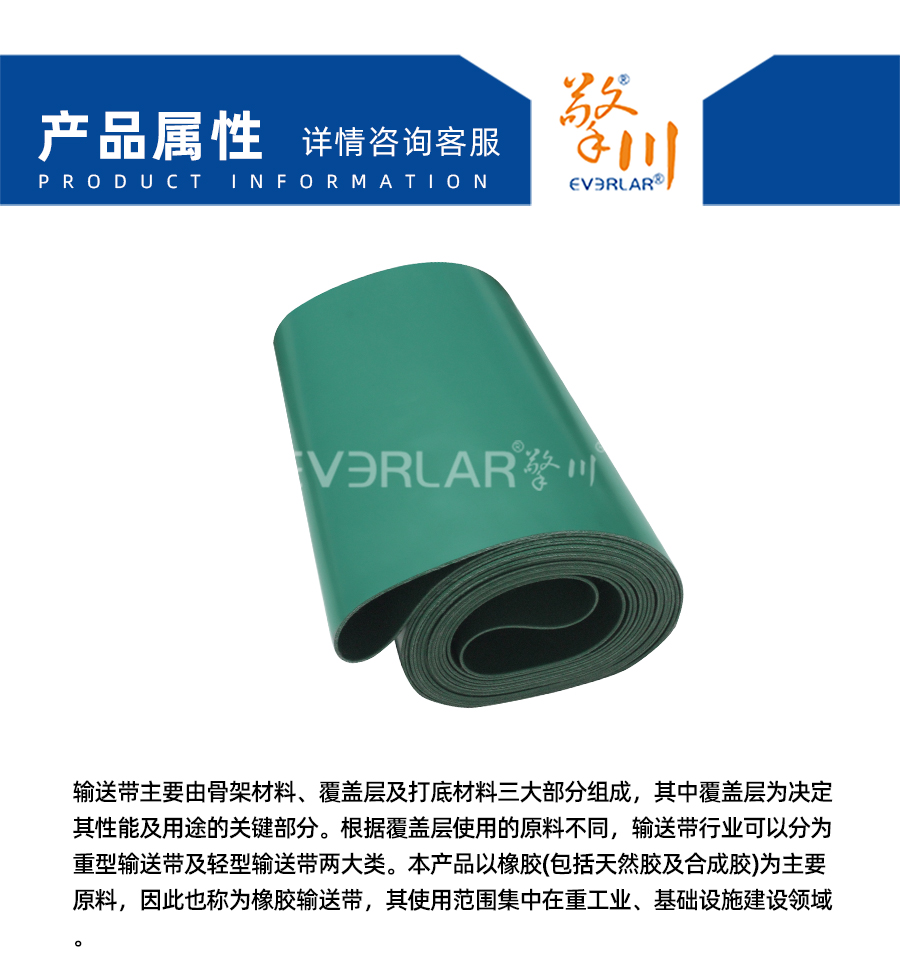 輸送帶主要由骨架材料、覆蓋層及打底材料三大部分組成,其中覆蓋層為決定其性能及用途的關(guān)鍵部分。根據(jù)覆蓋層使用的原料不同,輸送帶行業(yè)可以分為重型輸送帶及輕型輸送帶兩大類。本產(chǎn)品以橡膠(包括天然膠及合成膠)為主要原料,因此也稱為橡膠輸送帶,其使用范圍集中在重I業(yè)、基礎(chǔ)設(shè)施建設(shè)領(lǐng)域。