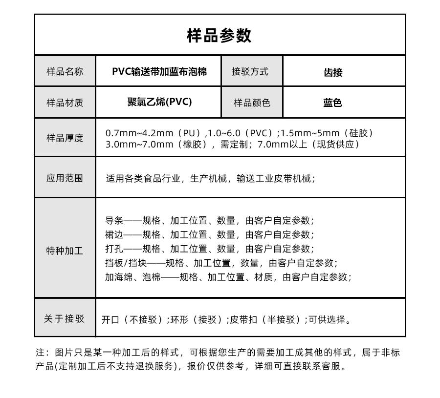 | 樣品名稱 | PVC輸送帶加藍(lán)布泡棉 | 加工方式 | 齒接 |