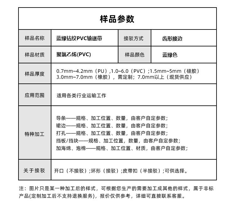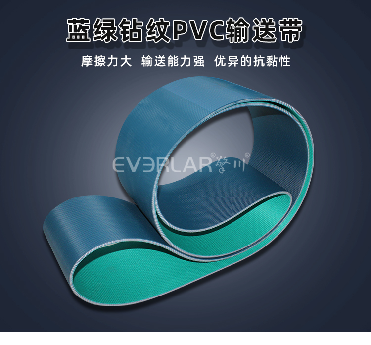 產(chǎn)品名稱:藍(lán)綠鉆紋PVC輸送帶耐溫防靜電易清潔工業(yè)皮帶