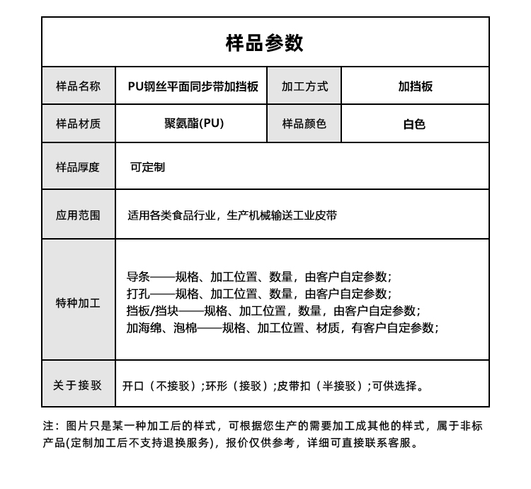產(chǎn)品名稱:白色聚氨酯鋼絲平面同步帶加擋板物流包裝耐磨耐油PU傳動帶工業(yè)皮帶