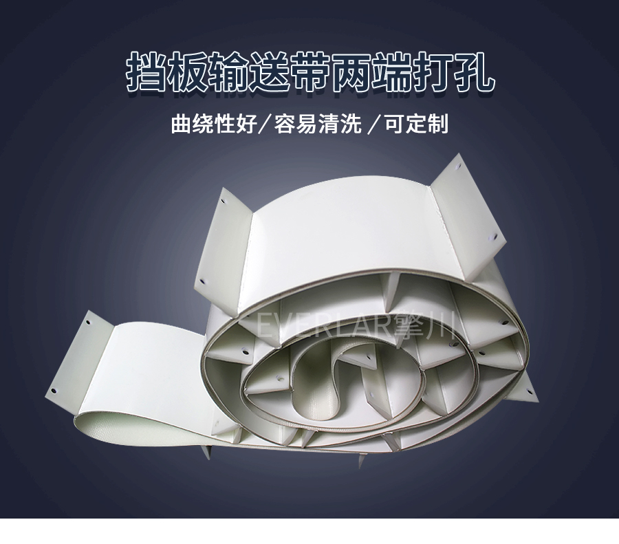 為食品、醫(yī)藥、包裝、日化提供一站式特殊定制從工廠到倉(cāng)儲(chǔ),PU輸送帶加擋板兩端打孔滿足多元輸送