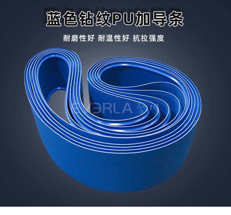為食品、醫(yī)藥、包裝、日化提供一站式特殊定制糖果加工輸送配件:藍(lán)色PU鉆紋輸送帶導(dǎo)條應(yīng)用